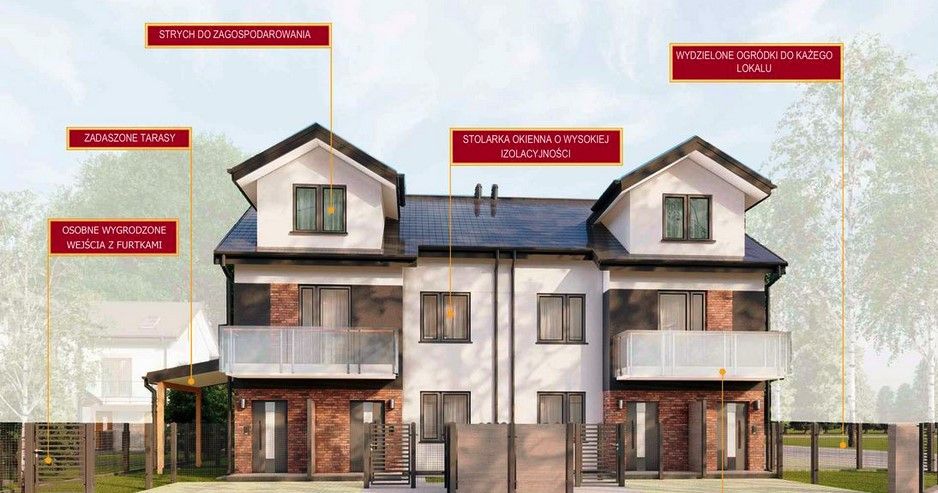 Każde z oddzielnym wejściem, klatką schodową, wiatrołapem, domofonem, furtką wejściową i ogródkiem.