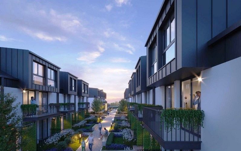 Niskie budynki trzy kondygnacyjne.